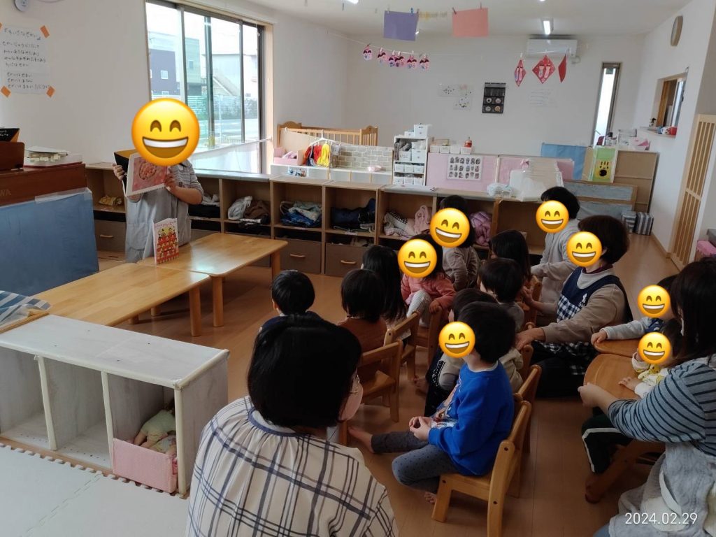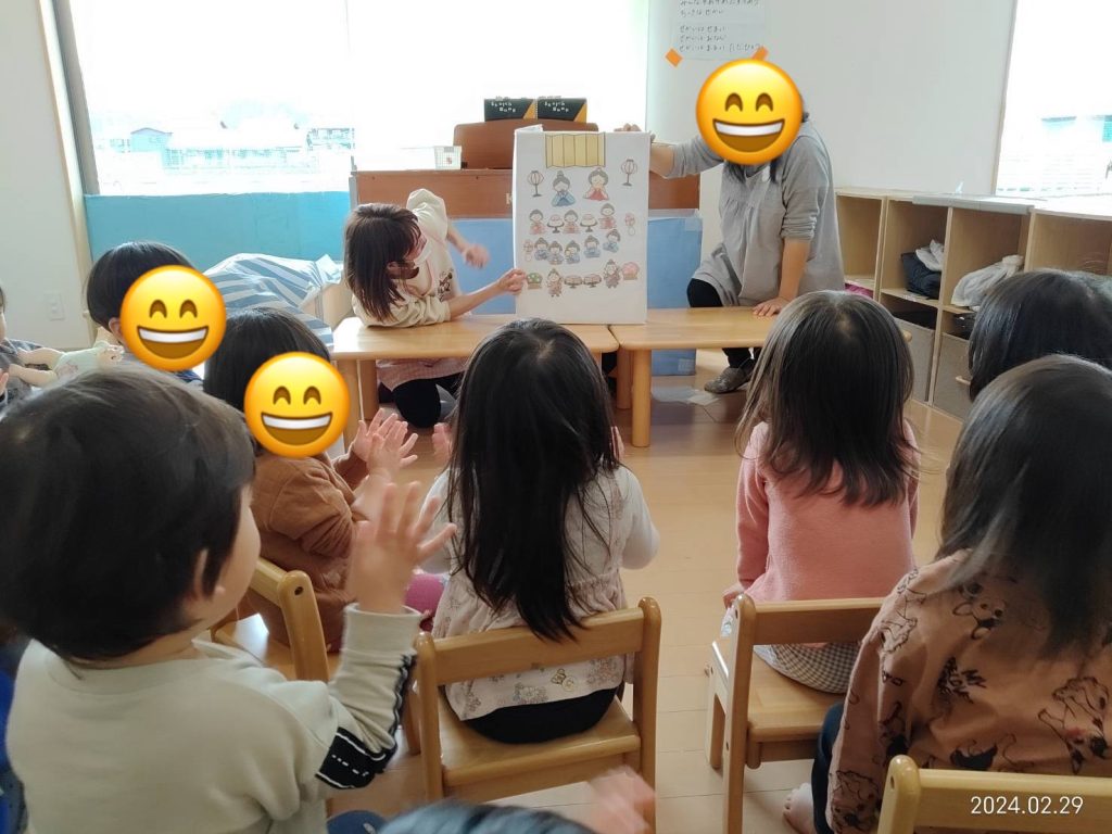 『ひなだんとんとことーん』という絵本を見たり、ひなまつりのお歌を歌いながら、パネルシアターを楽しみました。